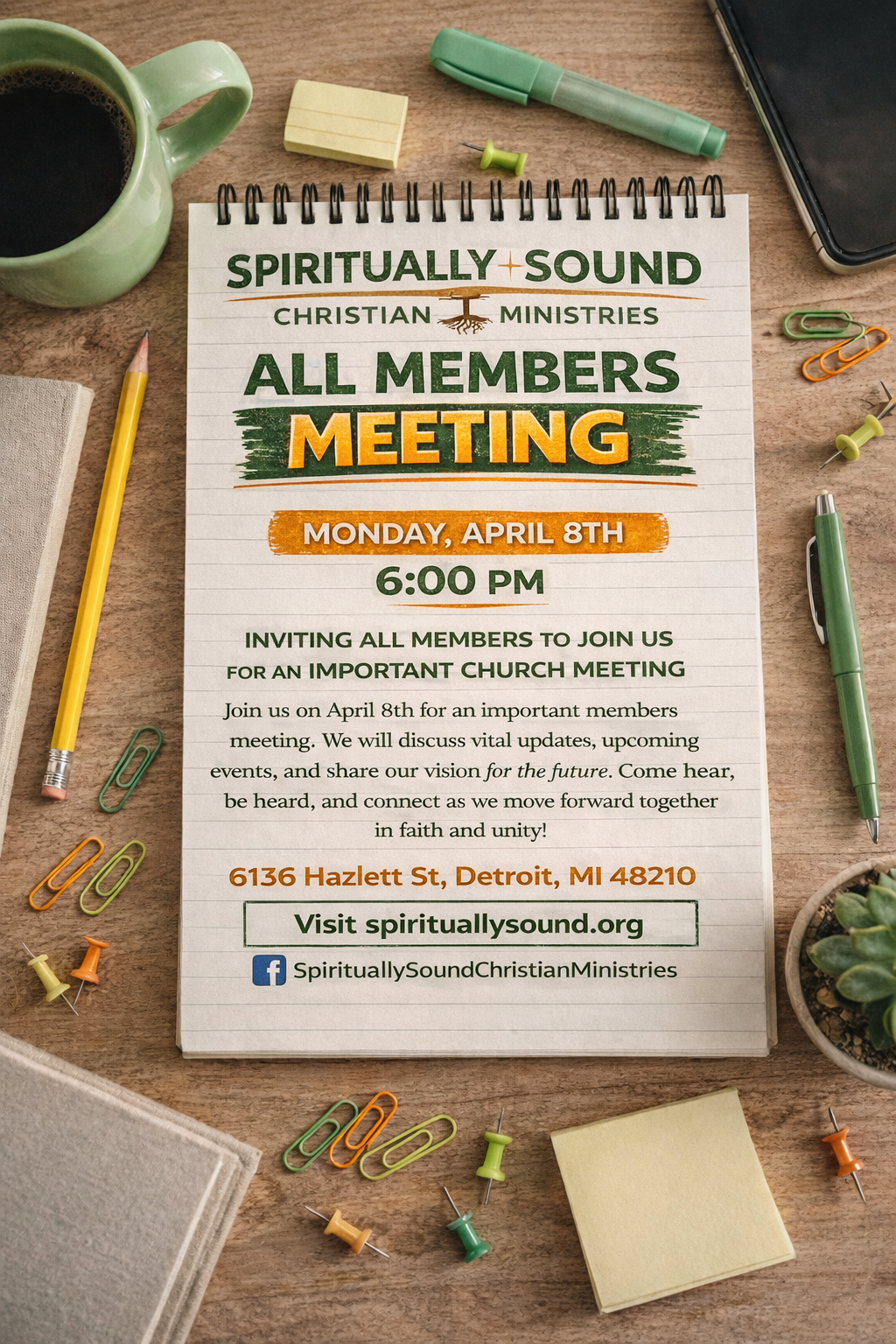 Spiritually Sound Christian Ministries invites all members to attend our important All Members Meeting on April 8th at 6 PM. This gathering is designed to keep our church family informed, aligned, and moving forward together in unity.